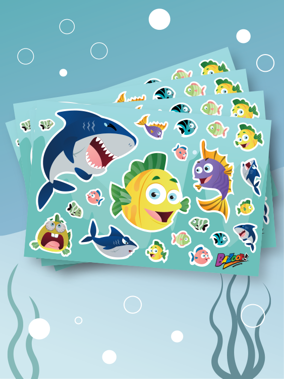 Sticker sheets displaying Teeny Weeny Fish, his friends, and Sharky from the book How Teeny Weeny Fish Accidentally Saves the Day! Includes stickers in different sizes and expressions of the characters to enjoy the book’s fun even further! This sticker set comes in a pack of 2 sheets, each with 21 stickers.